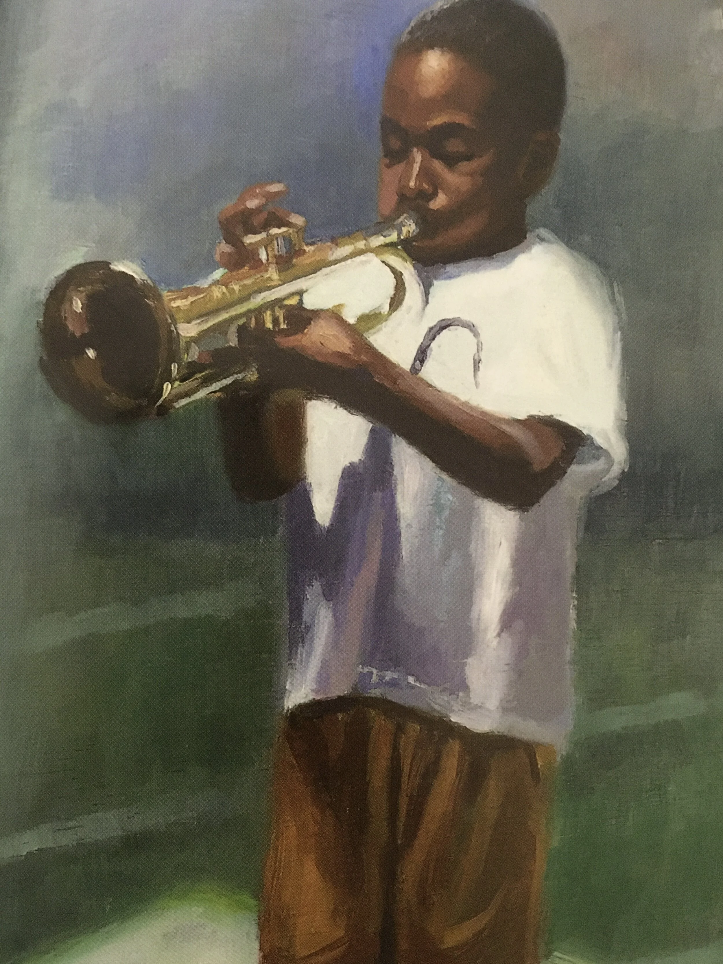 My favorite part of this book are the realistic and unique paintings by Trinidadian illustrator Colin Boots, especially the beautiful paintings of little Louis carrying and playing his cornet (very near and dear to my heart, as I have been a trumpet player since I was around his age).